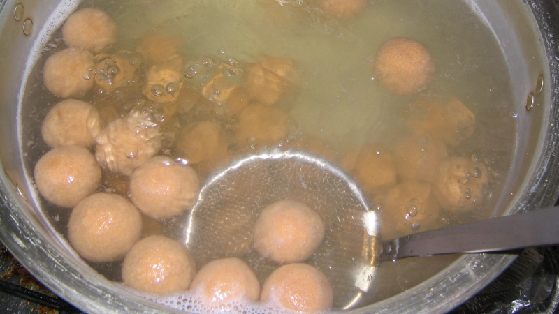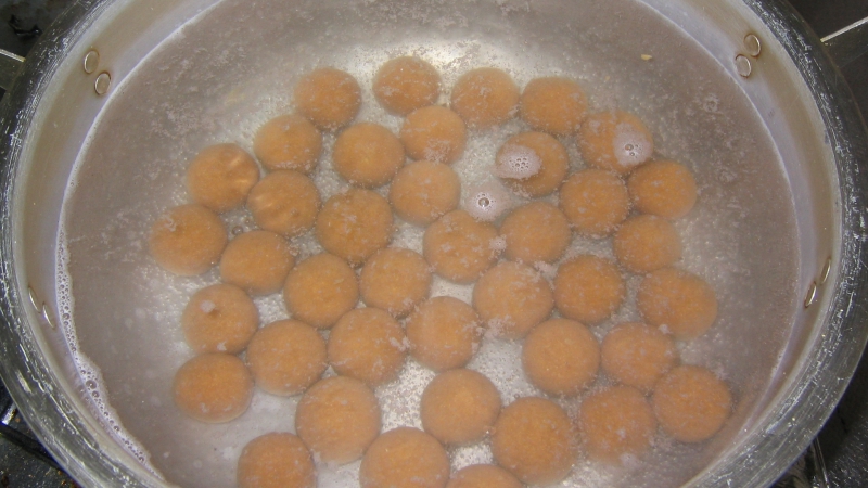 ナベにたっぷりとお湯を沸かし、ボイリーを入れます。入れたままにしておきますと、ナベの底にボイリーがくっ付いてしまいますので、時々底からはがすようにかき混ぜます。