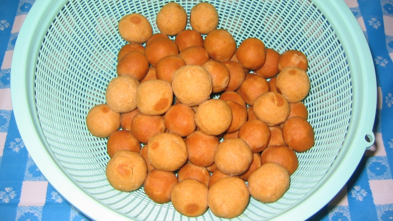 ボイリーの大きさにも寄りますが、5分から10分程度しますとゆで上がったボイリーが浮いてきますので、すくい上げていきます。