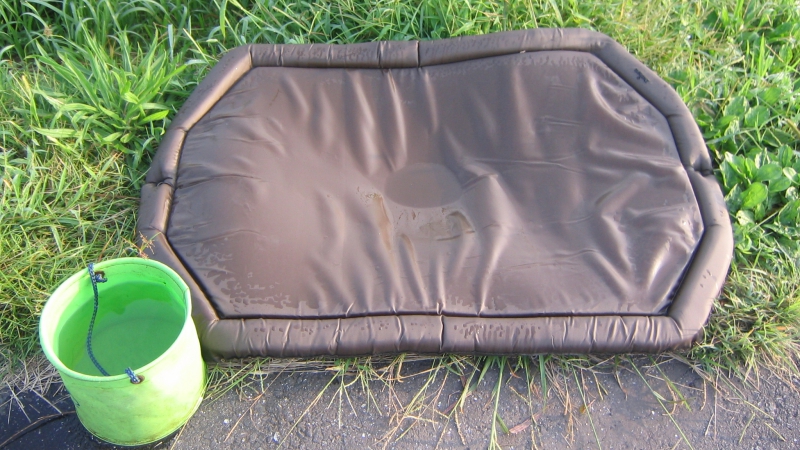 マットはタックルのセッティング後すみやかに広げておきます。鯉が釣れてから慌てて広げるようでは意味がありません。写真のマットの場合は両端にペグ用の穴が開いていますので、ここを利用して固定しておくと、風でとばされることはありません。ペグを打てない場所に置く場合は、水を入れたバケツなど重いものをマットに乗せておきます。