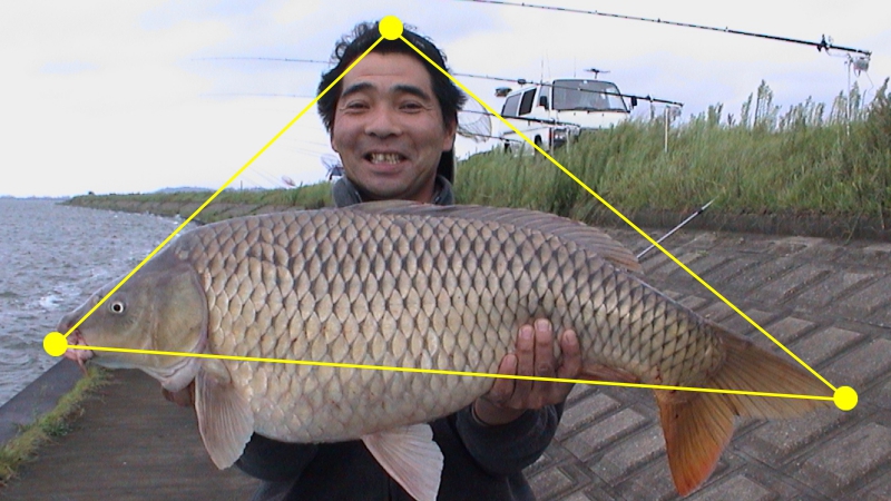 1.大きな三角形を撮れ!: 人間の頭、鯉の口、尾鰭の先 を結ぶ三角を大きく撮る