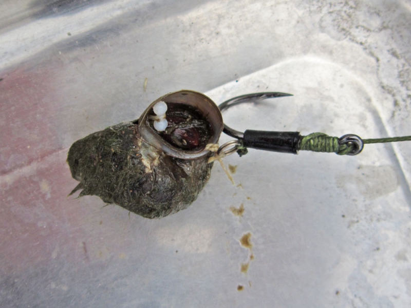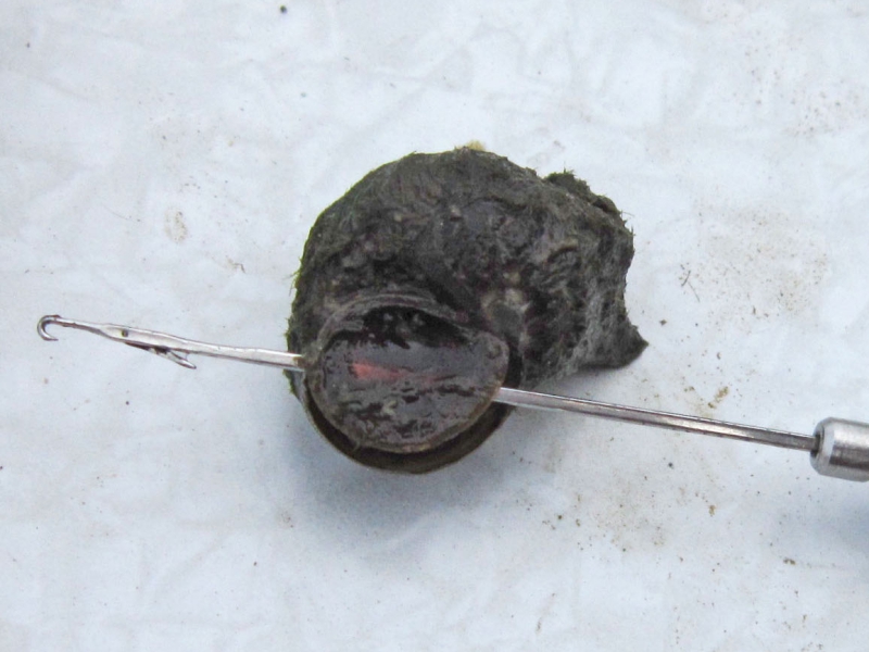 これは、2013年にHまんきんたんさんと北浦でご一緒した時に教えて頂いた方法です。殻が柔らかいマルタニシをヘアリグに付けるのに便利な方法です。