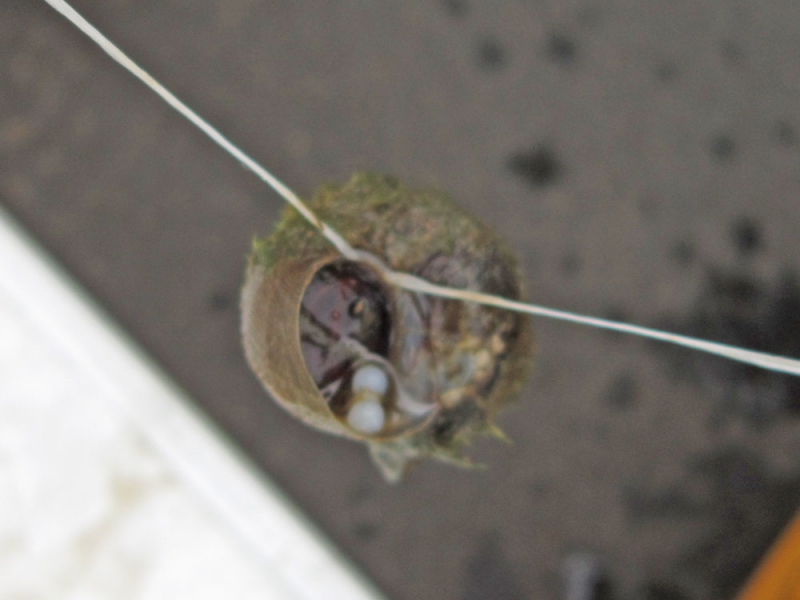 (1)水に浸けておいたタニシを取り出します。蓋が閉まる前に蓋と平行にボイリーニードルを通し、ラインをかけてニードルを引き抜きます。ラインはニードルにかけた部分が少し出るところでストップさせます。