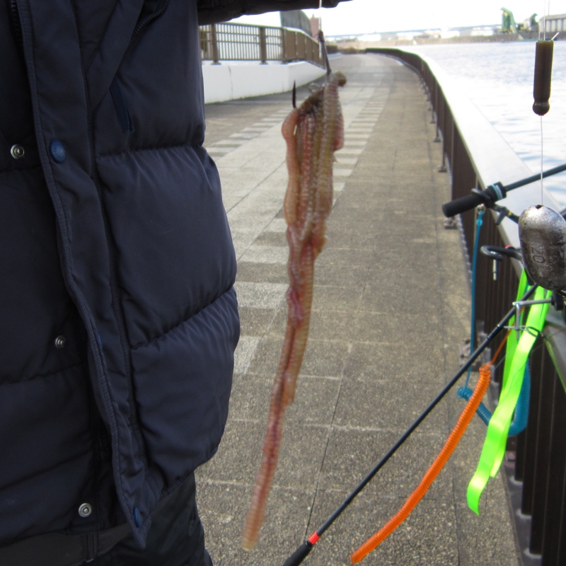 ゴカイの大きさにもよりますが、3匹から5匹程度をチョン掛けにします。ゴカイは頭部の方が平たく大きい形をしていますのでそこにハリを通しますが、「チヌ」「海津」「フカセ」など細めのハリを使っています。通常サイズのゴカイですと10cmから15cmくらいあります。ハリ付けするゴカイは生きが良くて動きがあるものの方が鯉にアピールできると思います。ゴカイはちぎれやすいので 、ハリ付けからエサの投入までそっと扱います。ゴカイは一部の釣具屋でも入手可能ですが、 釣り場のゴカイを採取して使ったほうが喰いがいいと言われています。バチ抜け時に網で掬って捕るのが効率の良い取り方です。