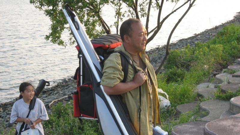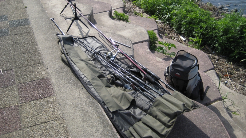 担ぎ込みの基本スタイルともいえるフレームザックとの組み合わせです。歩いて荒川に来る時はこのスタイルですが、自転車を使う場合は、ボックスに折り畳みタモや餌、小物類を入れ、そのボックスを大き目の板を固定した自転車の荷台にくくり付けます。