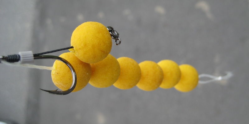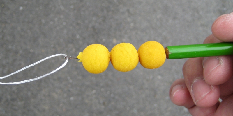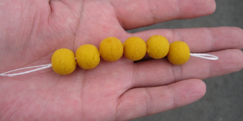 ニードルにボイリーを目一杯刺し込んで、二つ折りにしたPVAコードを引掛けて通します。同じ作業を繰り返してボイリーを所望の数だけ通します。次に、PVAを適度な長さに切り、端を2~3回結んでこぶを作ります。特にストッパーを入れなくても、こぶだけでボイリーは落ちることはありません。PVAコードに付属した説明書に記載されていますが、ボイリー同士の間に少し隙間ができるようにした方が、水が侵入して溶けやすくなるとのことですが、バケツに放り込んで溶け具合を観察したところ、写真の程度の間隔でもすべての隙間が同時に溶けました。あまり気にしなくてもいいようです。