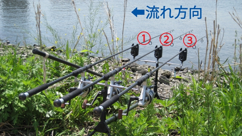 写真はシルヴァンさんが荒川で釣りをした時のタックルです。左側が下流で、穂先が多少下流向きになるようにロッドポッドをセットしています。1番の竿は最も岸に近く下流に向かって餌を打ち込んでいます。3番の竿は最も遠くで、岸から見て正面からやや下流に向かって餌を打ち込んでいます。2番はその中間的な位置です。岸から同じ距離に3本打ち込むのはあまり意味がなく、3本の条件がすべて違っていることが効果的な釣り方です。尚、鯉は餌に向かって下流から上流に泳いで来ることが多いと考えられているため、一般的にはラインが餌よりも上流になるようにします。