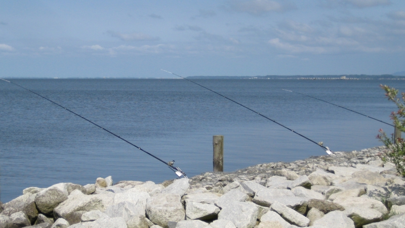 ロッドポッドが市販されるまでは、竿一本ずつ竿掛けを使用するのが一般的でした。代表的な竿掛けとしては、アングル竿掛け、ピトン竿掛け、バンクスティックなどです。鯉の取込みの際に隣のラインに絡まないように数mの間隔をあけてセットします。餌の打ち込み場所に応じて、取り込みが楽になるように竿の位置を決めます。写真は湖で流れがほぼない所ですので、竿のほぼ正面に餌を打ち込んでいます。