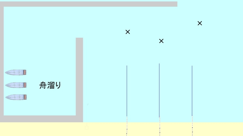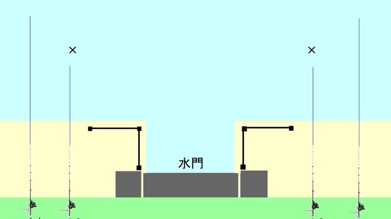 水門などのストラクチャがある場合、基本的にはその両サイドを攻めてみます。図は竿を2本ずつ左右に並べた場合で、片側の2本は距離を変えて打ち込んでいます。水門の正面は深く掘られていますが、底が泥が溜まっている場合は餌を打ち込まないのが無難です。尚、舟溜りに繋がった水門の場合は、舟が出入りするためにラインが引っ掛からない所に打ち込む必要があります。水門の左右いずれかに、杭があったり水底に著しい変化があったりする場合、思い切ってその変化がある方に竿を集中させる場合もあります。