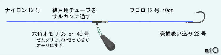 利根川で青魚を狙うようになってから、仕掛けは極力シンプルにするようになりました。ゴロタが多く沈んでいるポイントを攻めることが多く、根掛かりも頻繁に起るため天秤は使いません。ハリス絡みの防止として、フロロハリスの根本5cmくらいの範囲をチューブで覆います。チューブはサルカン2号を差し込むとちょうど止まる太さのものを選んでいます。