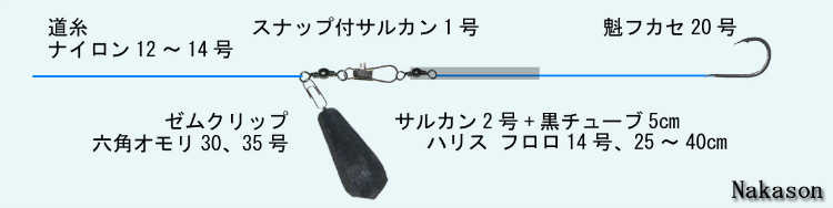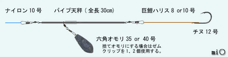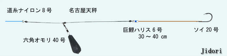 柔らかいM調子の石鯛竿にAbu6500を組み合わせているため、道糸は細めの8号がバランスがとれます。仕掛けはいたってシンプルで、名古屋天秤にハリス30cmから40cm付けます。ハリはタニシを使うようになってからソイを愛用しています。捨てオモリにする場合は、オモリを付けるフックの引っかけ部分を少し切り落とします。