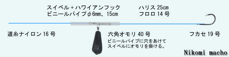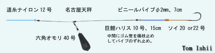 マッチョさんは早春から晩秋まで利根川で青魚を狙っています。この仕掛けは、MCFメンバーの中では最もシンプルなものです。道糸とハリスの結節部はスイベルとハワイアンフックを使い、その上をハリス絡み防止のΦ6mmビニールパイプで覆います。パイプ中央に横穴を開け、その穴を通してオモリのフックをスイベルに掛けます。