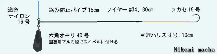 マッチョさんのもうひとつの仕掛けを紹介します。道糸に結んだスイベルの他端に、園芸用のアルミ線を使用して捨てオモリを付けます。スイベルの首に30cm程度の長さのワイヤーを付け、そのワイヤーの根本15cmくらいに絡み防止パイプをかぶせます。巨鯉ハリスを使っているので、吸い込み時の抵抗が少ない仕掛けです。