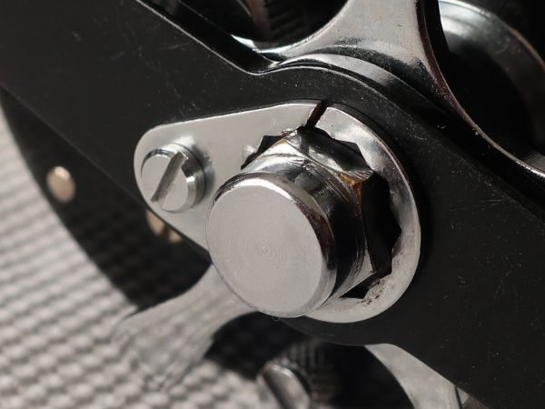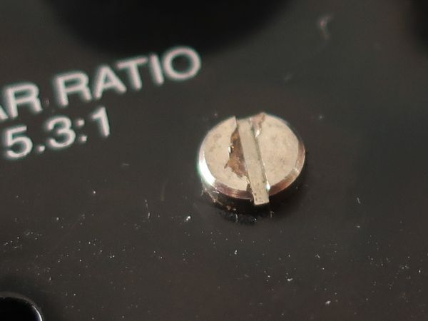 右サイドプレートを固定するネジの頭の溝が潰れています。ドライバーのサイズが合っていないまま回すと、こうなりがちです。外す際に少し固さを感じましたが、慎重に取り外すことができました。ネジ山側にダメージはないようなので、洗浄してそのまま使用します。