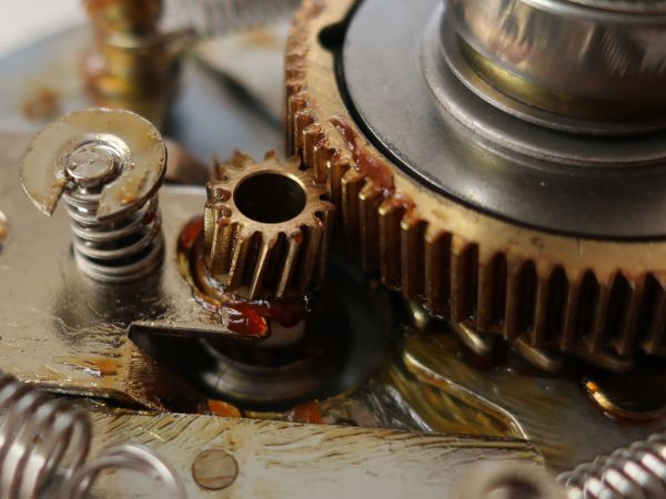 ドライブギヤ周辺には、劣化したグリスが黒く変色して残っていました。綿棒で触れると一部は固着しており、分解前にハンドルを回した際に感じたブレーキがかかったような重さの原因はこれだったようです。各パーツを丁寧に洗浄し、新しくグリスを塗布しました。