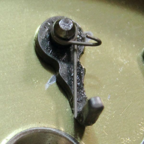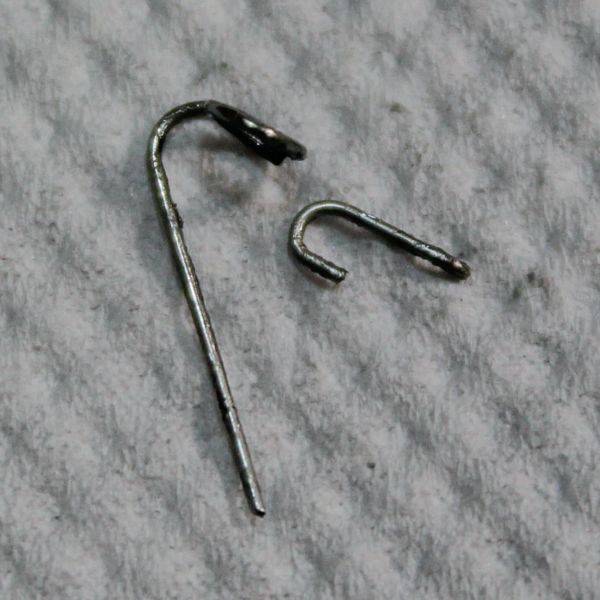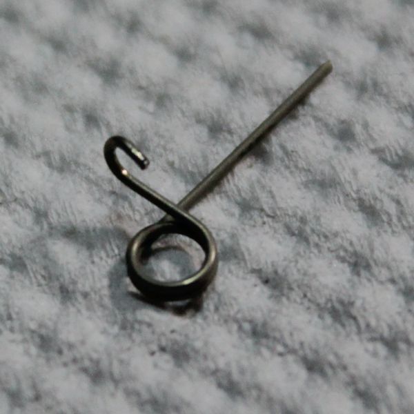 写真が破損したクリックスプリングです。ご覧のとおり、フックの部分が折れています。なお、全体に変形が見られますが、これはスプリングを取り外す際に変形してしまったもので、今回の故障とは関係ありません。