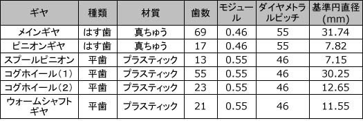 上の図をご覧いただくとおわかりのように、Ambassadeur 7000には、主に5種類のギヤパーツが使用されています。それぞれのギヤについての主要なスペックを、以下の表にまとめました。順にご説明いたします。