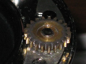 次に、メインギヤとピニオンギヤをご覧ください。いずれも真ちゅう製で、歯すじが斜めになっているのが特徴です。これが「はす歯(ヘリカルギヤ)」と呼ばれるもので、実際には歯がらせん状になっています。