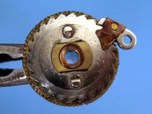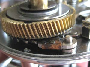 ラチェット機構は、メインギヤの下側に設けられています。メインギヤを外して裏側から見てみると、山形の歯を持つ「ラック」と呼ばれるパーツが確認できます。これに「爪」と呼ばれる部品が噛み合うことで、逆回転を防止するわけです。