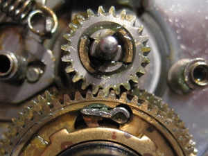 このふたつのドライブギヤの切り替えを担うのが、低速ドライブギヤに内蔵されたラチェット機構です。写真3には高速ドライブ時のラチェットの状態を、写真4には低速ドライブ時の状態を示しています。ラチェットのツメの動きによって、どちらのギヤが有効になるかが自動で判断される仕組みです。