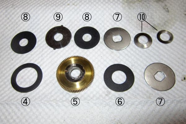 最後に、⑩スプリングワッシャー2枚を組み込みます。このとき、⑩の向きには要注意です。断面形状を記号で表すと ) になりますが、2枚の組み合わせは必ず )( としてください。)) や (( のような組み合わせでは、ドラグ調整の感度が極端に高くなり、実用上の問題が生じます。なお、()は同じスプリングワッシャの組み合わせの場合にかぎり成り立ちますが、異形の組合せでは成立しません。