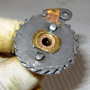 まず、①メインギヤブッシングの中心穴および6箇所の凹みに、綿棒を使ってグリスを塗布します。裏返して、2箇所の突起およびラチェットの歯部分にも同様にグリスを塗ります。