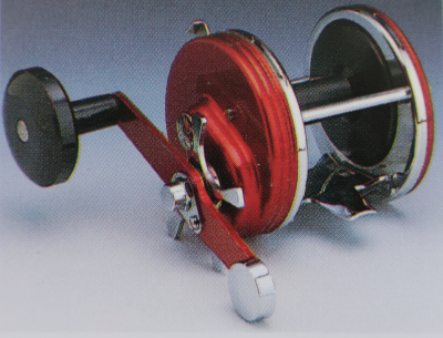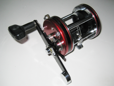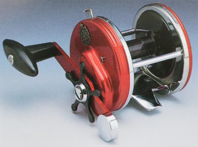 サイドプレートは鮮やかな赤。スタードラグはハンドルよりも外側に装着されており、右側のサイドカップは、自動二段変速の機構部分が張り出した特徴的な形状をしています。この張り出しは、現在のABU大型リールにもそのまま受け継がれています。