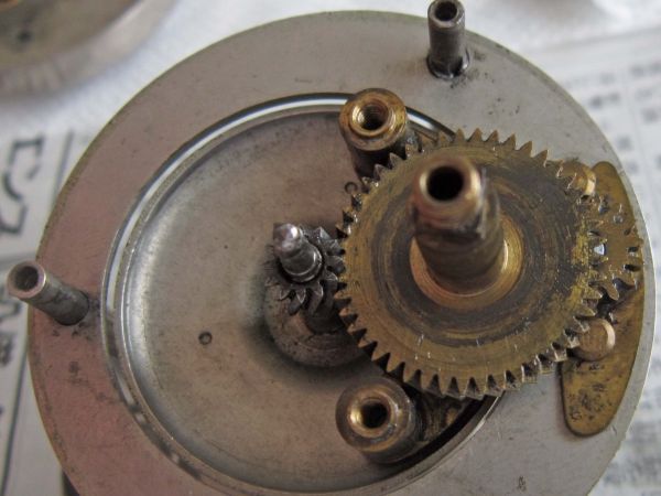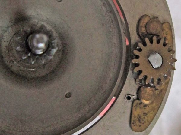 また、プレートに取り付けられたネジの頭にも注目すると、興味深い工夫が見て取れます。フレームとサイドプレートを固定しているのは平頭のネジが4本。そして、ギヤモジュールをプレートに取り付けるための丸頭ネジが2本。役割に応じて使い分けられたこの構造からも、当時の設計者の配慮が感じられます。