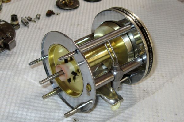 ①スプールは全体を丁寧に洗浄します。クラッチピン周辺はやや入り組んだ構造になっているため、ブラシや綿棒を使って細かい汚れを落とします。写真では見えませんが、裏面にあるスプールピニオンギヤも同様にブラシと綿棒でしっかり洗浄してください。また、スプール両端の内側にはラインの汚れがこびりついていることが多いため、ここも丹念にブラッシングします。