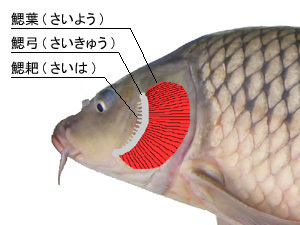 一本の鰓弓からは、2列の鰓葉が出ています。鰓耙も鰓弓から生えていますが、これらはそれぞれ別の組織です。鰓弓の後方には鰓葉が並び、ここで水中の酸素を取り込み、同時に体内の二酸化炭素を放出するという、重要なガス交換が行われています。鰓葉は「鰓弁(さいべん)」とも呼ばれています。