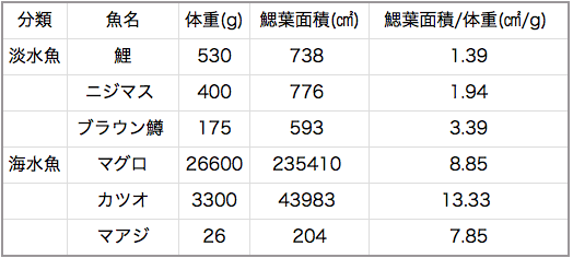 参考文献1のデータをもとに、単位体重あたりの鰓葉面積(c㎡/g)を下表にまとめてみました。マグロは絶えず泳ぎ続ける回遊魚で、体内の酸素消費量が非常に多いため、鰓葉面積も8.85c㎡/gと大きくなっています。カツオはそれ以上、マアジもマグロに近い数値です。