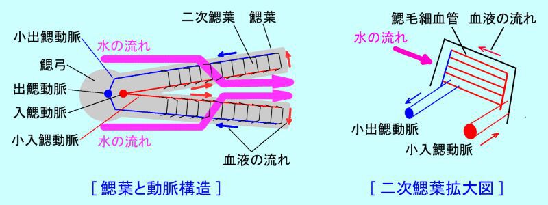 下の左図は、鰓弓とそこから出た一対の鰓葉の断面図です。入鰓動脈から流れてきた血液は、小入鰓動脈(赤線)を通って鰓葉へと送られます。鰓葉の表と裏には、さらに細かな「二次鰓葉(または二次鰓弁)」が並び、その中を鰓毛細血管が走っています。血液は毛細血管を通って小出鰓動脈(青線)に至り、出鰓動脈へと戻っていきます。
