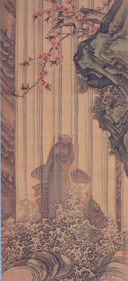 「登龍門」のページでも触れましたが、中国の『後漢書』や『三秦記』に記された「鯉が滝を登って竜に変身した」という故事に由来して、鯉の滝登りは吉兆の象徴として語り継がれてきました。この伝承は日本にも伝わり、芸術の題材としても広く用いられるようになります。