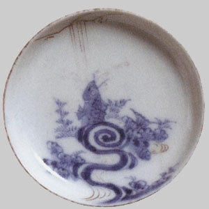 ここでは、そうした器の中から、古伊万里の染付皿と、漆器の飯椀を一例としてご紹介します。いずれも前述の絵画作品の流れを汲む構図が見受けられ、日本人が長きにわたってこの題材を大切にしてきたことが感じられます。