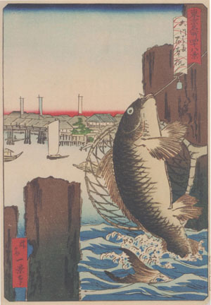 この百本杭周辺は、海水と淡水の交じり合う汽水域にあたり、クロダイやスズキも釣れると伝わっています。ただ、この絵の構図からは、私はどうしても堂々たる良型の鯉を思い描いてしまうのです。