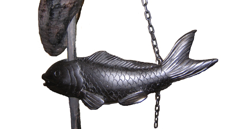 この小猿には、さまざまな形の意匠が見られますが、なかでも代表的なのが鯉や鯛の彫刻です。写真に写る小猿も、鯉の姿をした見事なものです。鯉は淡水魚の王、鯛は海水魚の王として並び称される存在であり、そうした象徴性もあって用いられたのでしょう。