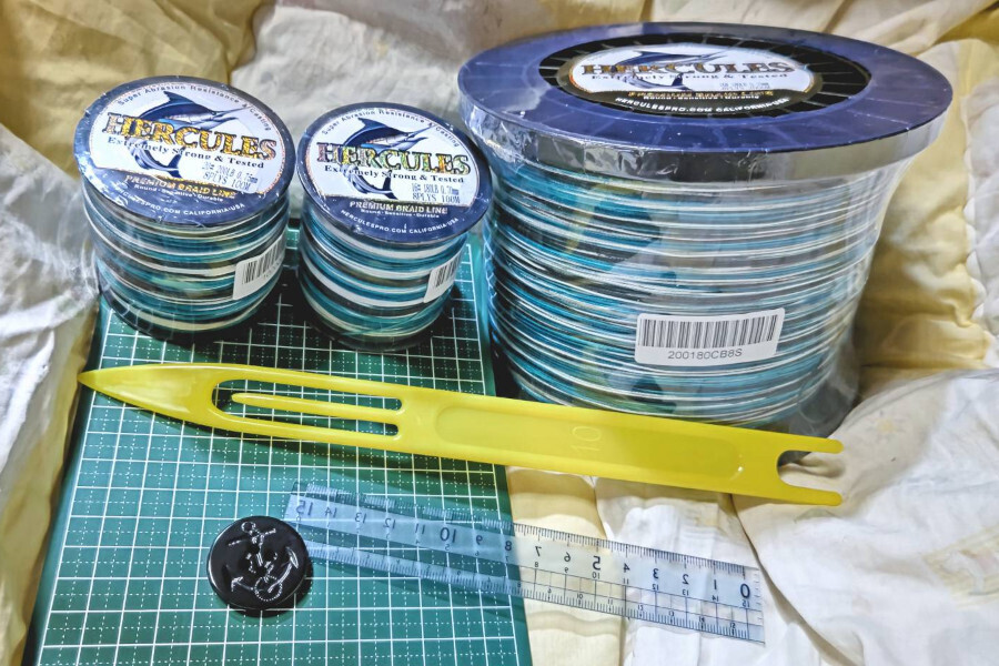 まず初めに必要な素材を揃えました。糸の色にはブルー系のカモフラージュを選択し、網の本体はPE16号を使用。編み始めの底部(ヘソの輪の芯)と、網の枠に取り付ける最終段は強度を増すためにPE20号を使います。