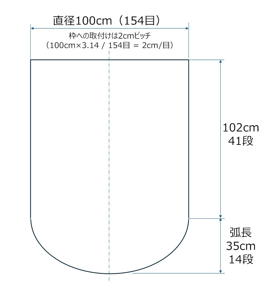 編み始めは30目からスタートし、10目ずつ増やしながら14段目で154目に到達する設計です。その後、154目のまま41段編み進めることで、円筒型の網を形成していきます。市販の三角形の網に比べると、円筒形に近い形状となる見込みです。