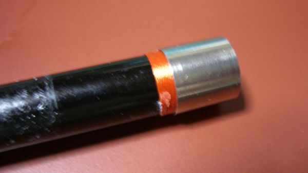 それでは、口金取り付けの作業開始です。まず、竿と口金の調整です。竿と口金のすき間は、1mm前後と思われますので、それに合った太さの糸を口金の幅分竿に巻きます。(この際の糸の材質は何でも良いと思います。)糸は、ある程度のテンションを掛けながら、糸同士が重ならないように、またこぶなどが出来ないように、丁寧に、平らに巻きます。