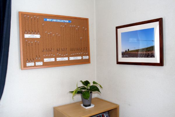 視線を反対側に移すと、ドアを入ってすぐの壁面にA4サイズの写真を2枚並べて掛けております。これらのパネルは、もともとジグソーパズル用のものと思われるフレームを再利用しております。白いフレームが壁の色に近いため、背景には黒のフェルト(百円ショップで購入)を使用しました。黒の背景は反射光が目立つため、対面に窓や照明が直接当たらないよう、壁面がくる位置に設置しています。