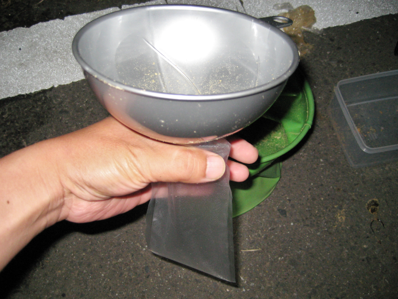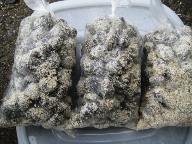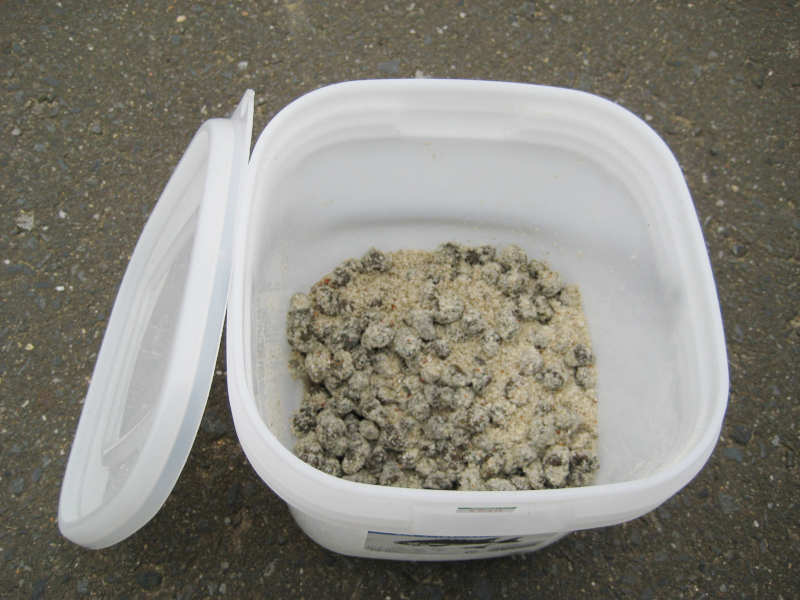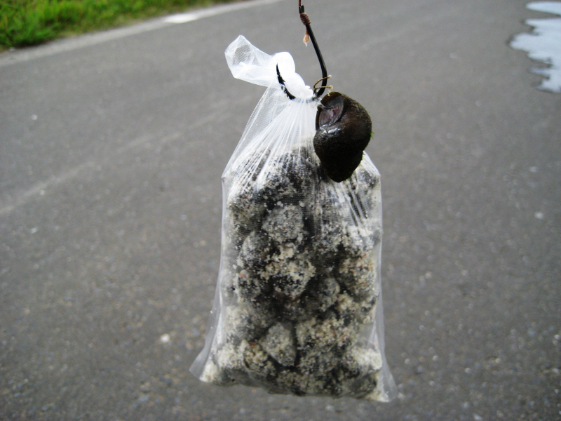 ただし、タニシをそのままPVAに入れると、滲み出る水分ですぐにPVAが溶けてしまいます。そこで私は、粉状のエサや米ヌカなどをタニシにふりかけて水分を吸収させてから、PVAに詰めるようにしています。