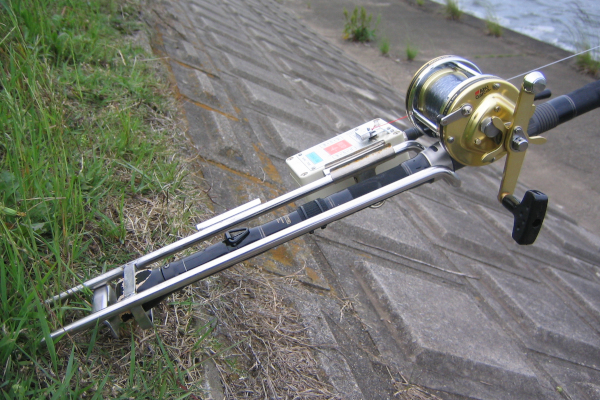 主材にステンレスの角パイプを用いた、軽量型のピトンです。水郷の護岸など、地面に垂直に刺せるポイントでは、実に使い勝手のよい一品です。脚の回り止めには、着脱式のステンレス丸棒のL字部品を採用。石突きの受け部分はロッドに応じてスライド調整できる仕様になっており、実釣の際に微調整が効きます。