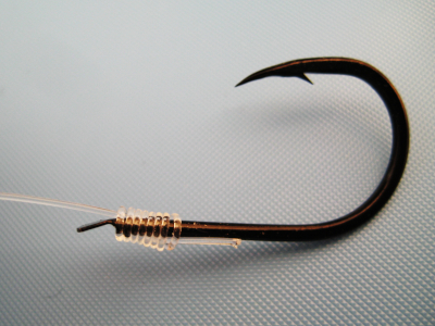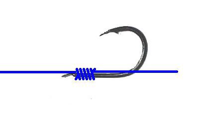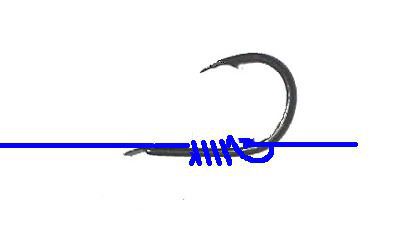 非常に美しい結び目です。ハリの軸にすべて巻きつける結び目のため、他の結び方のようにハリスを無理に局部的に曲げる箇所がありません。写真はフロロハリス12号ですが、全く問題なく結ぶことができます。慣れないうちは結び目が美しくならないことがありますが、間違っていないかよくチェックして下さい。