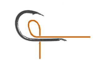 左手にフックを持ち、右手にハリスを持って、図のようにやや大きめの輪を作ります。