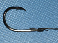 この工程は「枕掛け」と呼ばれています。魚がかかった際に、ハリスとフックのチモトが擦れて傷むのを防ぐための工夫です。なお、枕掛けを省略した外掛け結びもありますが、私はこの一手間を大切にしています。