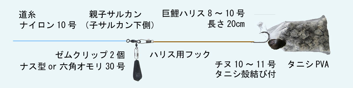 タニシを餌に用いた釣りについて、私と長年の盟友たちが使用しているリグの一例をご紹介いたします。いずれも主に青魚を想定した構成となっており、全体的に強度を重視した設計が特徴です。