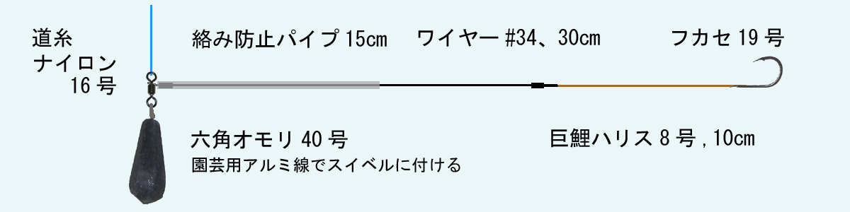 こちらも利根川本流用のリグで、道糸に結んだスイベルに園芸用のアルミ線で作った捨てオモリを取り付けています。また、スイベルの首のところには30cmほどのワイヤーを装着し、その根本15cmほどの範囲には絡み防止用のパイプを被せています。吸い込み抵抗を軽減するため、ハリスには太めの巨鯉用ハリスを使用しており、大型魚にも十分対応できる設計です。