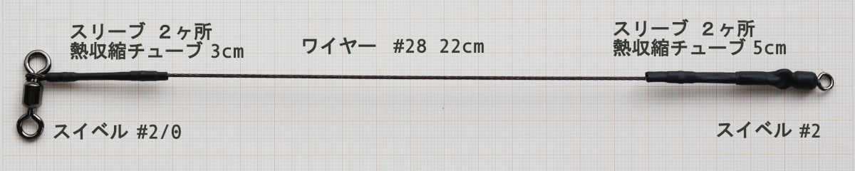 高波興業淡水倶楽部の工事長さんは、利根川本流で使用する「煮込みマッチョさんのリグ(2)」のワイヤー部分を、このように組んでいます。両端にはスリーブを二つずつ使い、その上から熱収縮チューブをかぶせる丁寧な仕立てです。オモリとハリスについては、その都度釣り場の状況に合わせてアレンジしています。