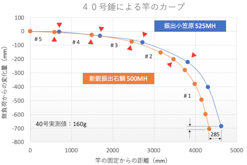 測定結果を見ると、「小笠原」は#2節から曲がりが大きくなっているのに対し、「新鋭」は#3節あたりから徐々に曲がり始めています。差はごくわずかですが、前回のテーパー率の推測どおり、新鋭は小笠原に比べて手元寄りからゆったりと曲がる傾向が確認できました。