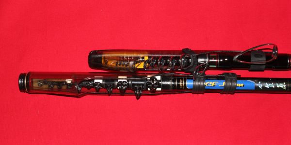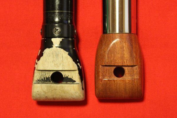 竿を取り出し、まずは石突きを見比べてみました。写真では右が新鋭振出石鯛(以下、新鋭)です。これまで使っていた小笠原の石突きは、黒の塗装が剥がれやすいのが難点でしたが、新鋭の石突きは非常に硬質な花梨材を使用しており、長く使っても外観の劣化が少なそうです。