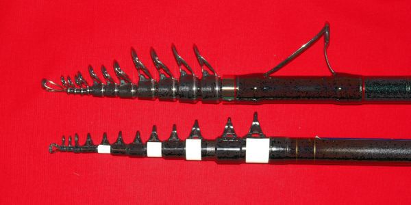 次に注目したのがガイドです。上が新鋭で、ひと目でガイドが大きいのがわかります。小笠原のガイドに長年慣れていたため、実はカタログを見ていた段階から少々違和感を覚えていました。実際、小笠原の元竿に使われていた一番大きなガイドが、新鋭では中間部のガイドとほぼ同等のサイズです。